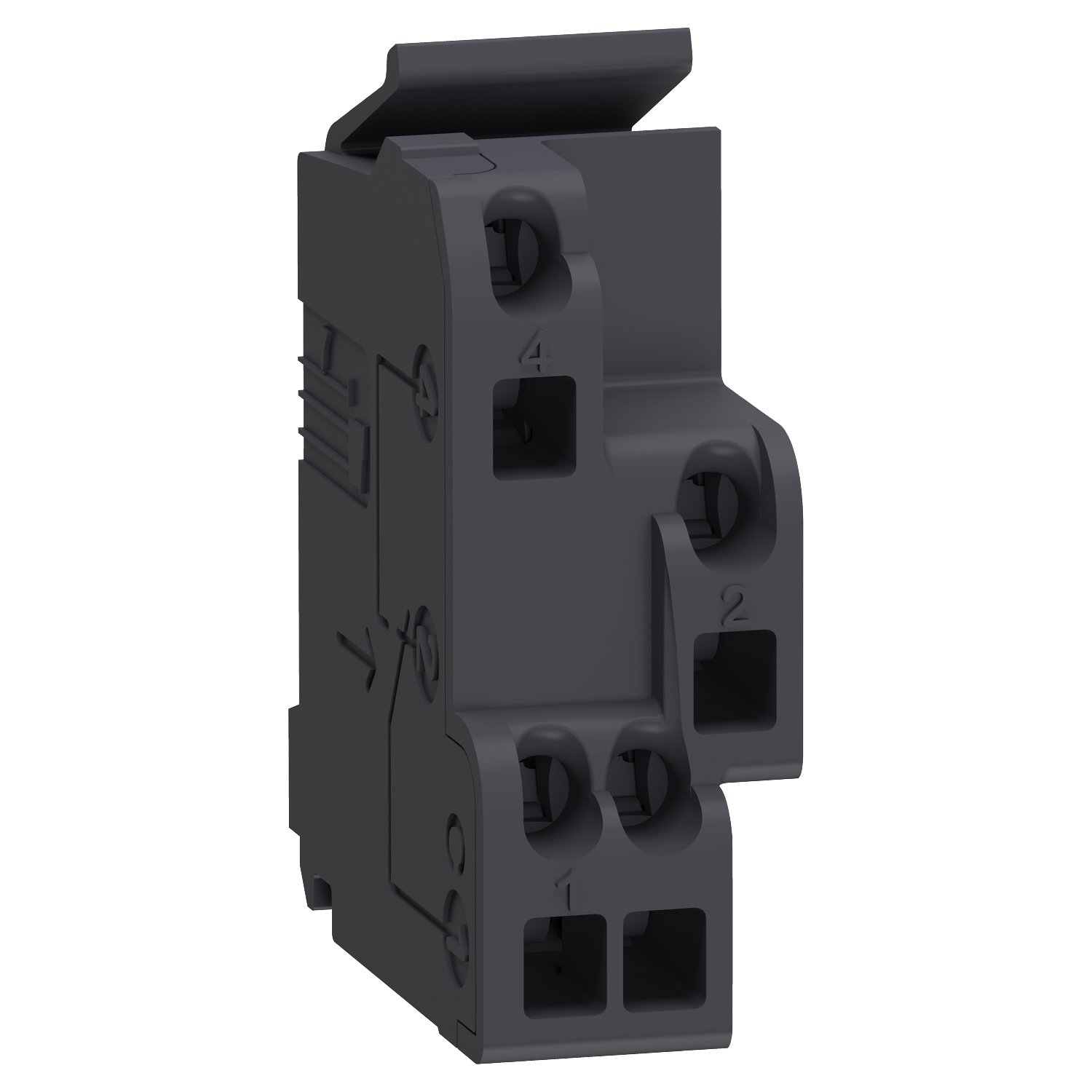 It is a single standard auxiliary contact that provides all the different indications remotely for ComPact NSX, ComPact NS, PowerPact Multistandard and EasyPact CVS circuit breakers. Remote status information are ON/OFF (OF), trip indication (SD) and fault-trip indication (SDE) for all circuit breakers types. The remote status information for trip indication due to an earth fault (SDV) is used for ComPact NSX and PowerPact Multistandard. The contacts are installed in the device in dedicated slots. This auxiliary contact is a common point changeover type contact with 1 normally open contact and 1 normally closed contact. The rated current is 6A and the minimum load is 100mA at 24 VDC for utilization categories are AC12/AC15/DC12/DC14. Screwless connections with spring terminals provide a fast and reliable connection. The section of connected cables is between 0.5 mm² (AWG20) and 1.5 mm² (AWG16). It complies with IEC 60947-5-1 standard.